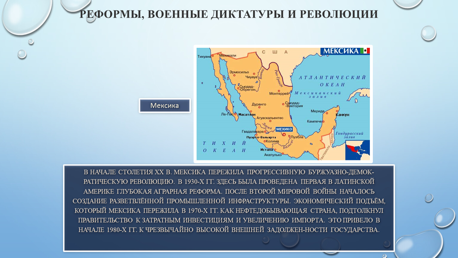 В начале столетия ХХ в. Мексика пережила прогрессивную буржуазно-демок-ратическую революцию. В 1930-х гг. здесь была проведена первая в Латинской Америке глубокая аграрная реформа. После Второй мировой войны началось создание разветвлённой промышленной инфраструктуры. Экономический подъём, который Мексика пережила в 1970-х гг. как нефтедобывающая страна, подтолкнул правительство к затратным инвестициям и увеличению импорта. Это привело в начале 1980-х гг. к чрезвычайно высокой внешней задолжен-ности государства.