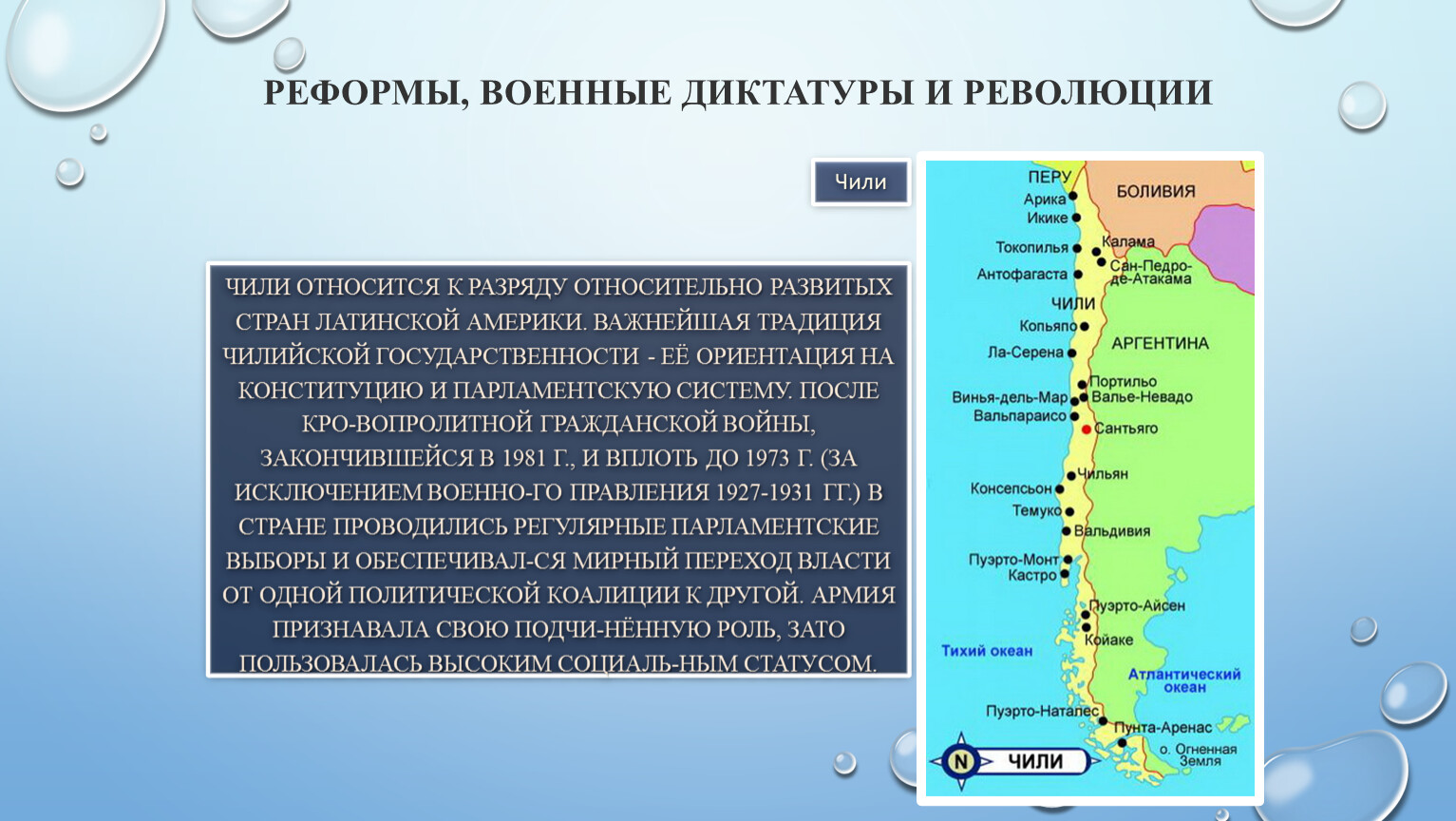 Чили относится к разряду относительно развитых стран Латинской Америки. Важнейшая традиция чилийской государственности - её ориентация на конституцию и парламентскую систему. После кро-вопролитной гражданской войны, закончившейся в 1981 г., и вплоть до 1973 г. (за исключением военно-го правления 1927-1931 гг.) в стране проводились регулярные парламентские выборы и обеспечивал-ся мирный переход власти от одной политической коалиции к другой. Армия признавала свою подчи-нённую роль, зато пользовалась высоким социаль-ным статусом.