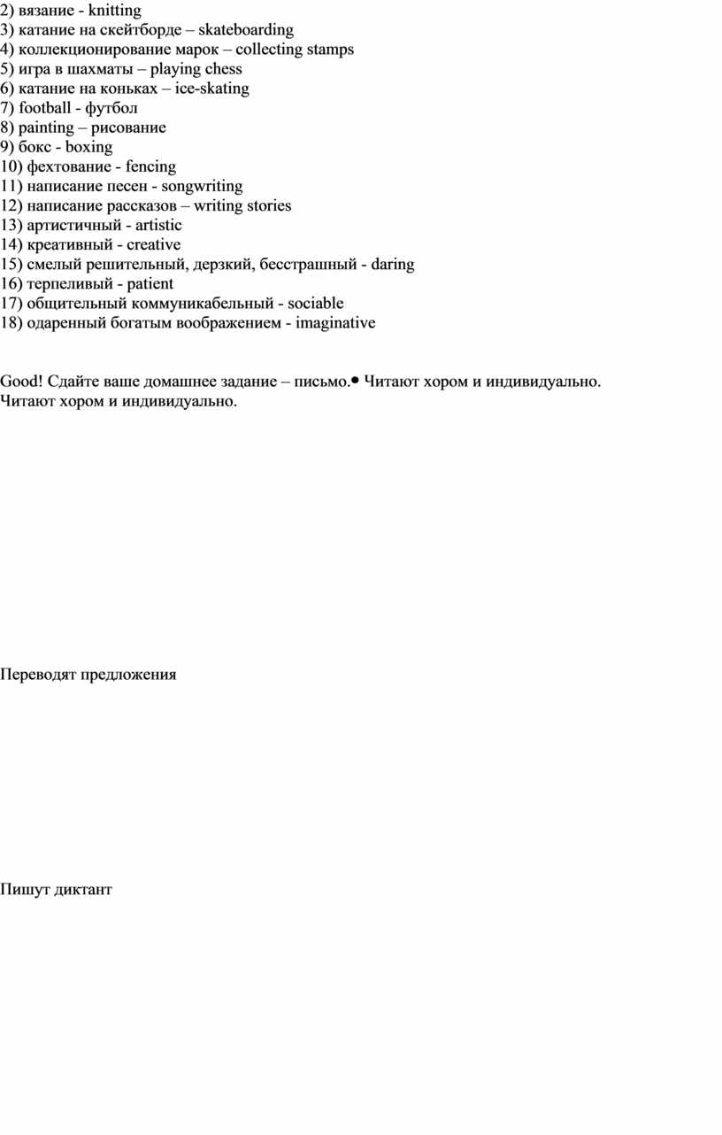 Раздает листочки для диктанта. 2) вязание - knitting 3) катание на скейтборде – skateboarding 13) артистичный - artistic