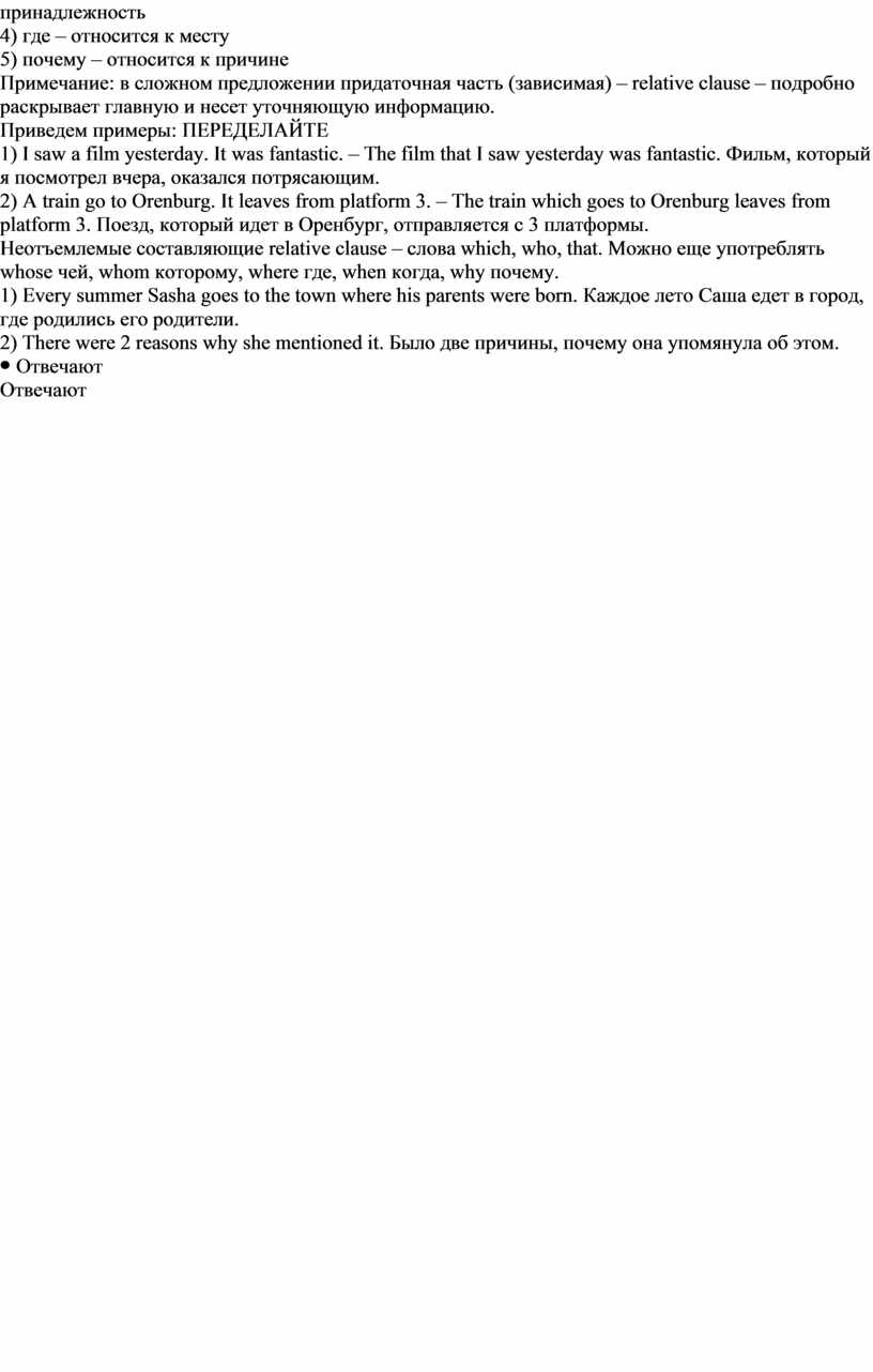 Next – ex. 5A. Проверим, как вы поняли правило. Относительные местоимения (кто, который, что, чей) и наречия (когда, где, почему) составляют определительные придаточные предложения. 1) кто/это относится к людям Приведем примеры: ПЕРЕДЕЛАЙТЕ Неотъемлемые составляющие relative clause – слова which, who, that. Можно еще употреблять whose чей, whom которому, where где, when когда, why почему. 1) Every summer Sasha goes to the town where his parents were born. Каждое лето Саша едет в город, где родились его родители. 2) There were 2 reasons why she mentioned it. Было две причины, почему она упомянула об этом.