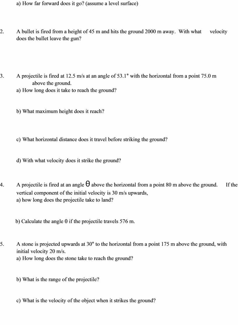 6. A bullet is fired from a height of 45 m and hits the ground 2000 m away. With what velocity does the bullet leave the gun?