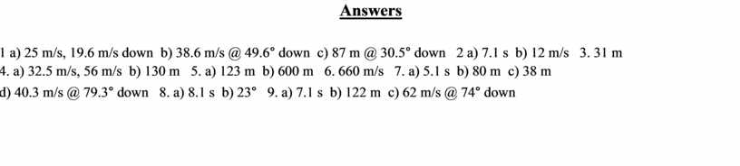 1 a) 25 m/s, 19.6 m/s down b) 38.6 m/s @ 49.6° down c) 87 m @ 30.5° down 2 a) 7.1 s b) 12 m/s 3. 31 m