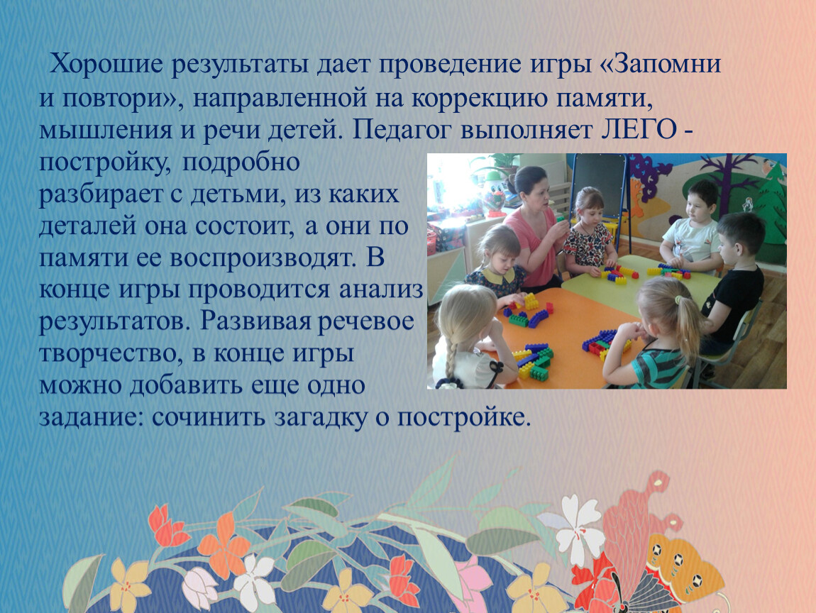 Хорошие результаты дает проведение игры «Запомни и повтори», направленной на коррекцию памяти, мышления и речи детей. Педагог выполняет ЛЕГО - постройку, подробно разбирает с детьми, из каких деталей она состоит, а они по памяти ее воспроизводят. В конце игры проводится анализ результатов. Развивая речевое творчество, в конце игры можно добавить еще одно задание: сочинить загадку о постройке.