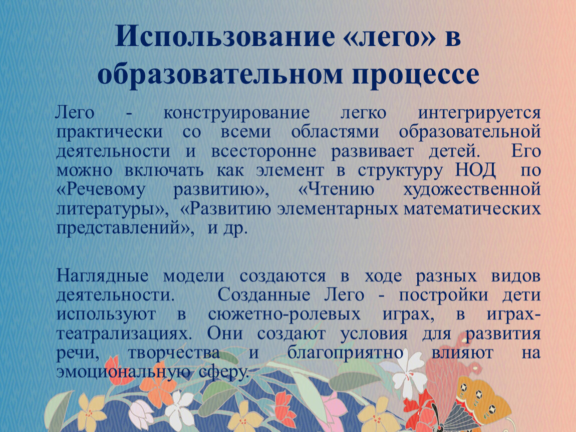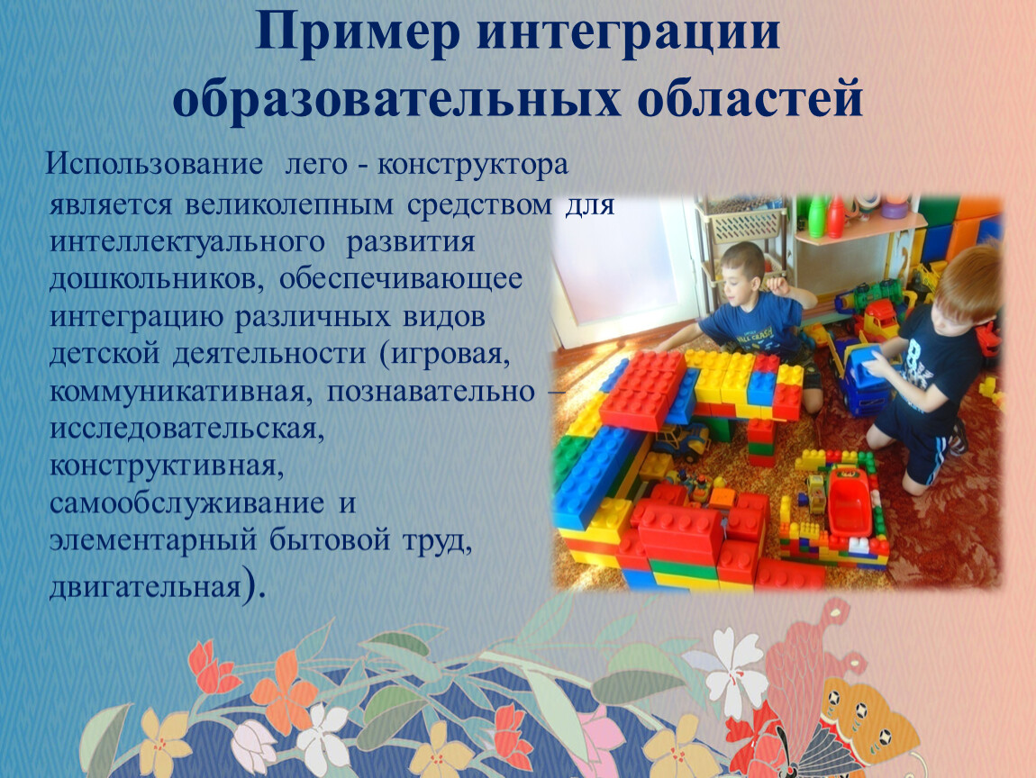 Использование лего - конструктора является великолепным средством для интеллектуального развития дошкольников, обеспечивающее интеграцию различных видов детской деятельности (игровая, коммуникативная, познавательно – исследовательская, конструктивная, самообслуживание и элементарный бытовой труд, двигательная).