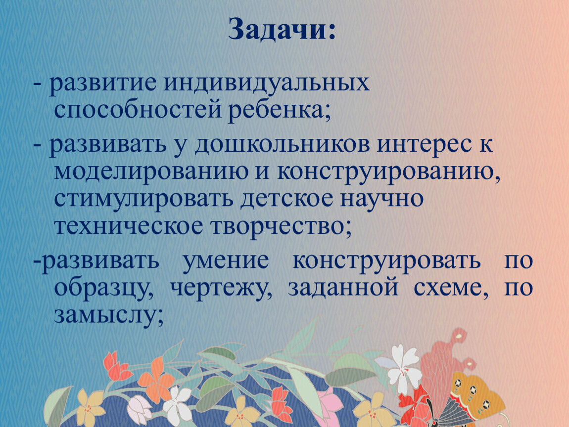 - развивать у дошкольников интерес к моделированию и конструированию, стимулировать детское научно техническое творчество;