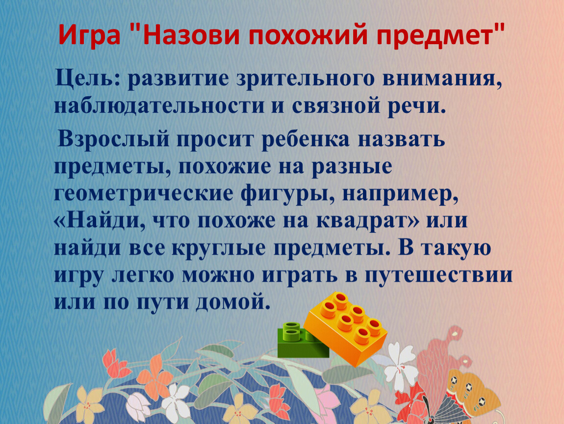 Взрослый просит ребенка назвать предметы, похожие на разные геометрические фигуры, например, «Найди, что похоже на квадрат» или найди все круглые предметы. В такую игру легко можно играть в путешествии или по пути домой.