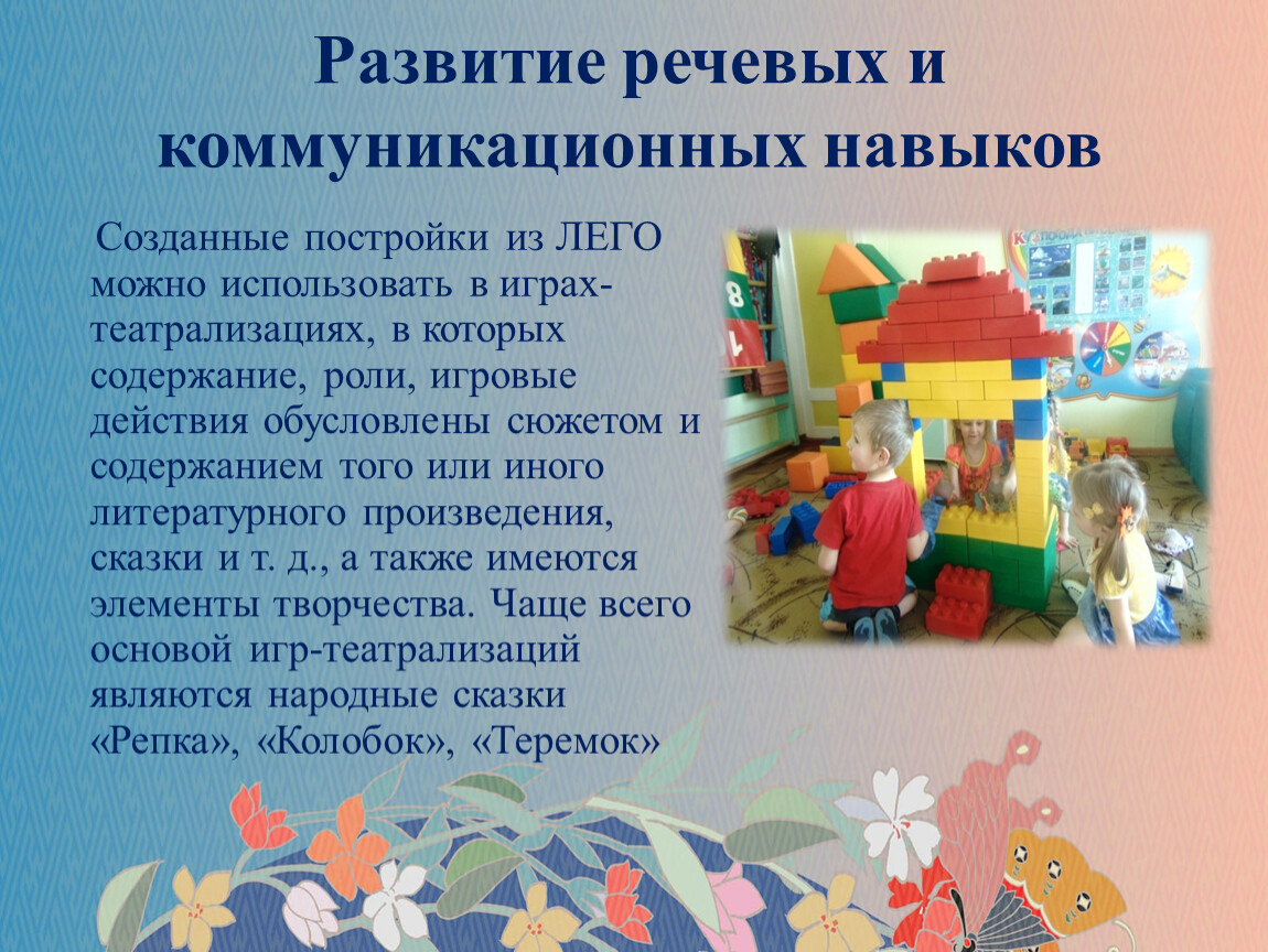 Созданные постройки из ЛЕГО можно использовать в играх-театрализациях, в которых содержание, роли, игровые действия обусловлены сюжетом и содержанием того или иного литературного произведения, сказки и т. д., а также имеются элементы творчества. Чаще всего основой игр-театрализаций являются народные сказки «Репка», «Колобок», «Теремок»