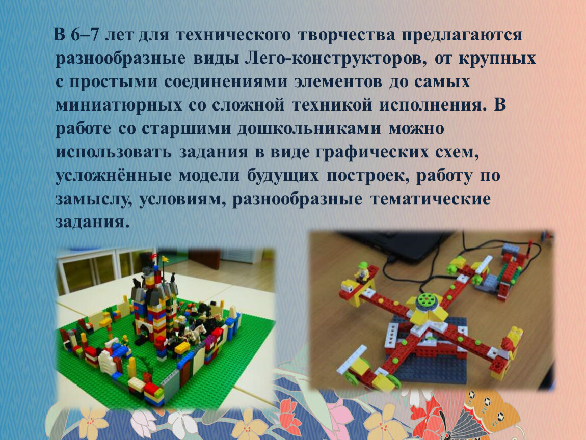 В 6–7 лет для технического творчества предлагаются разнообразные виды Лего-конструкторов, от крупных с простыми соединениями элементов до самых миниатюрных со сложной техникой исполнения. В работе со старшими дошкольниками можно использовать задания в виде графических схем, усложнённые модели будущих построек, работу по замыслу, условиям, разнообразные тематические задания.