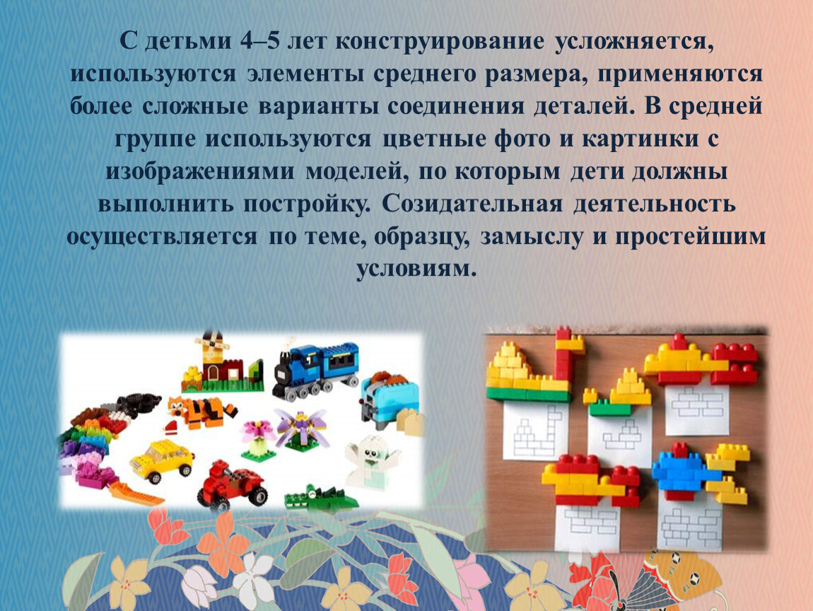 С детьми 4–5 лет конструирование усложняется, используются элементы среднего размера, применяются более сложные варианты соединения деталей. В средней группе используются цветные фото и картинки с изображениями моделей, по которым дети должны выполнить постройку. Созидательная деятельность осуществляется по теме, образцу, замыслу и простейшим условиям.