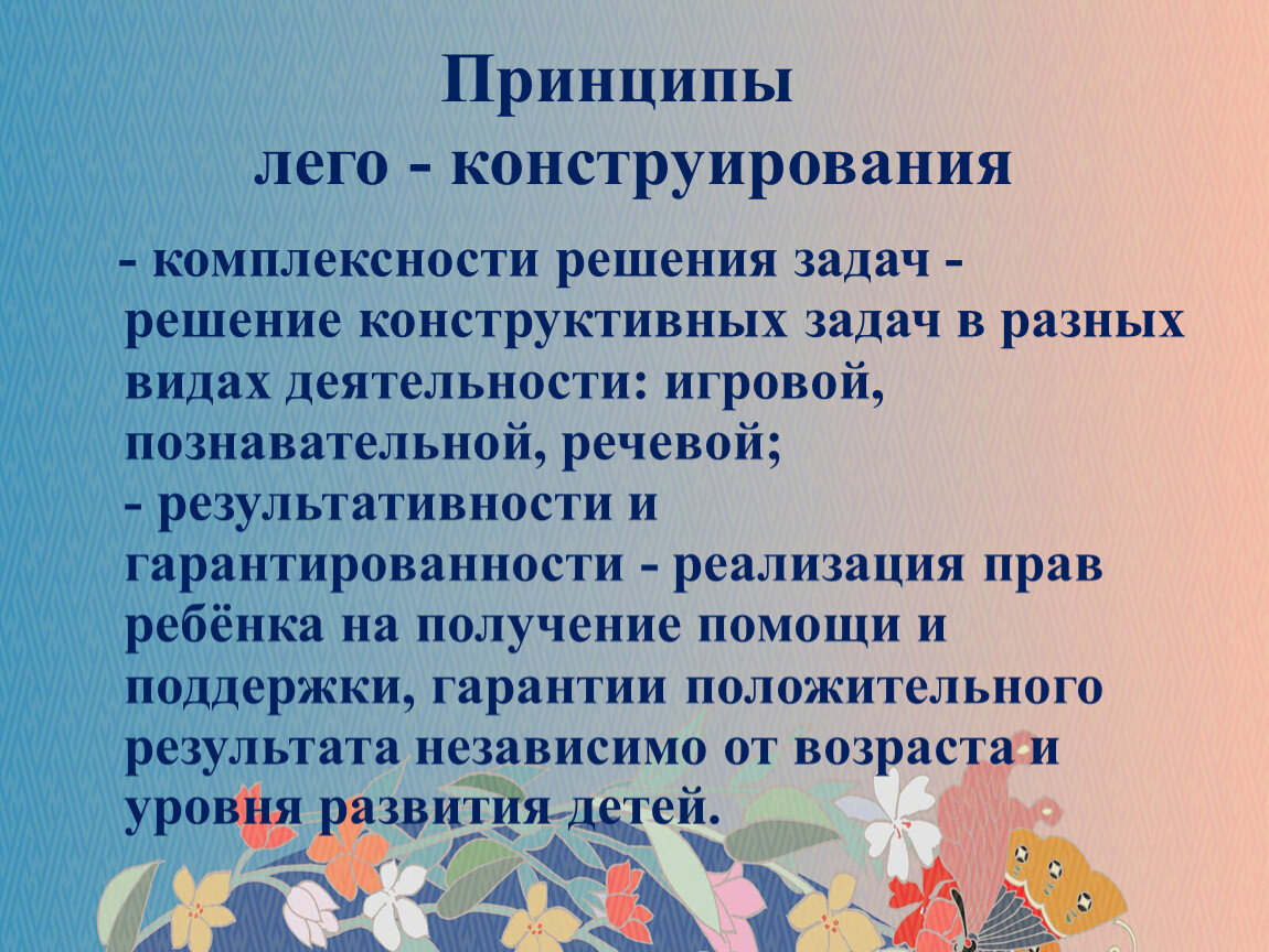 - комплексности решения задач - решение конструктивных задач в разных видах деятельности: игровой, познавательной, речевой;- результативности и гарантированности - реализация прав ребёнка на получение помощи и поддержки, гарантии положительного результата независимо от возраста и уровня развития детей.