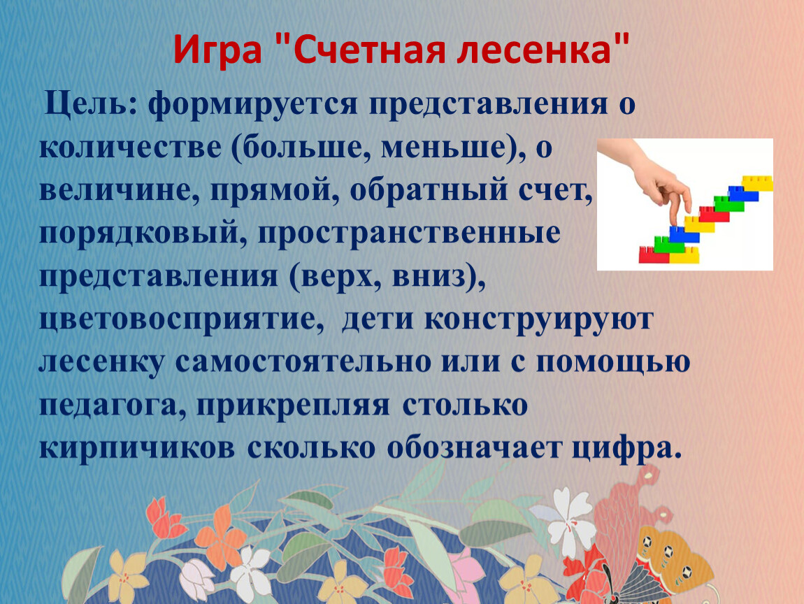 Цель: формируется представления о количестве (больше, меньше), о величине, прямой, обратный счет, порядковый, пространственные представления (верх, вниз), цветовосприятие, дети конструируют лесенку самостоятельно или с помощью педагога, прикрепляя столько кирпичиков сколько обозначает цифра.