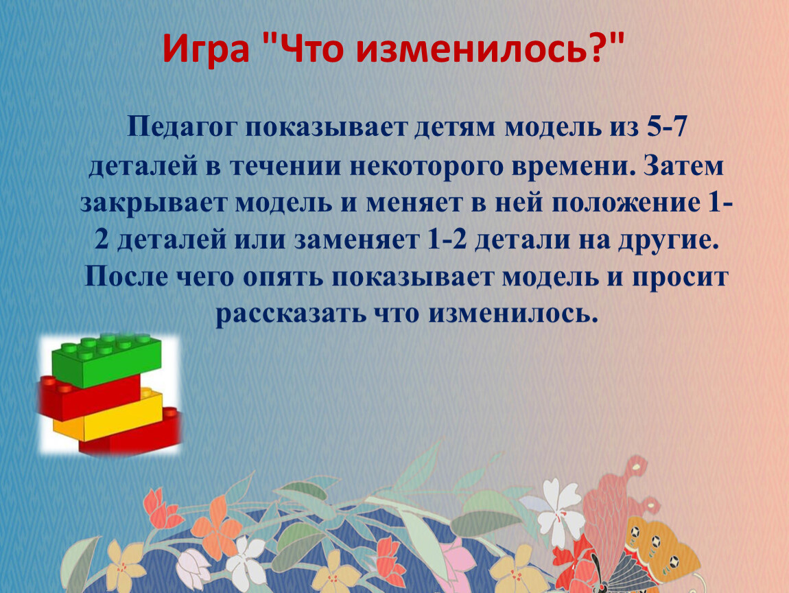 Педагог показывает детям модель из 5-7 деталей в течении некоторого времени. Затем закрывает модель и меняет в ней положение 1-2 деталей или заменяет 1-2 детали на другие. После чего опять показывает модель и просит рассказать что изменилось.