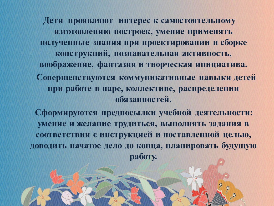 Дети проявляют интерес к самостоятельному изготовлению построек, умение применять полученные знания при проектировании и сборке конструкций, познавательная активность, воображение, фантазия и творческая инициатива.