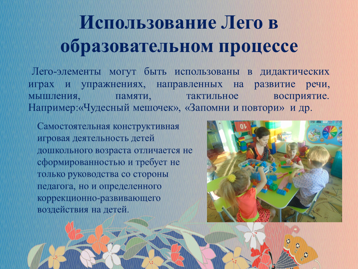 Лего-элементы могут быть использованы в дидактических играх и упражнениях, направленных на развитие речи, мышления, памяти, тактильное восприятие. Например:«Чудесный мешочек», «Запомни и повтори» и др.