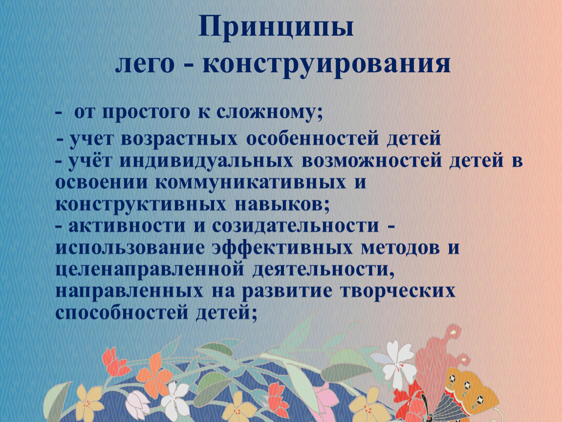 - учет возрастных особенностей детей - учёт индивидуальных возможностей детей в освоении коммуникативных и конструктивных навыков;- активности и созидательности - использование эффективных методов и целенаправленной деятельности, направленных на развитие творческих способностей детей;