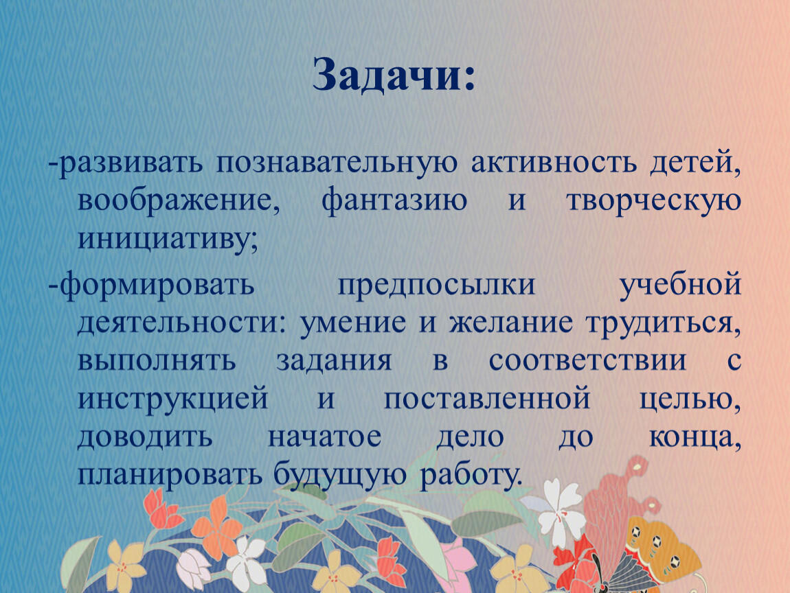 -формировать предпосылки учебной деятельности: умение и желание трудиться, выполнять задания в соответствии с инструкцией и поставленной целью, доводить начатое дело до конца, планировать будущую работу.