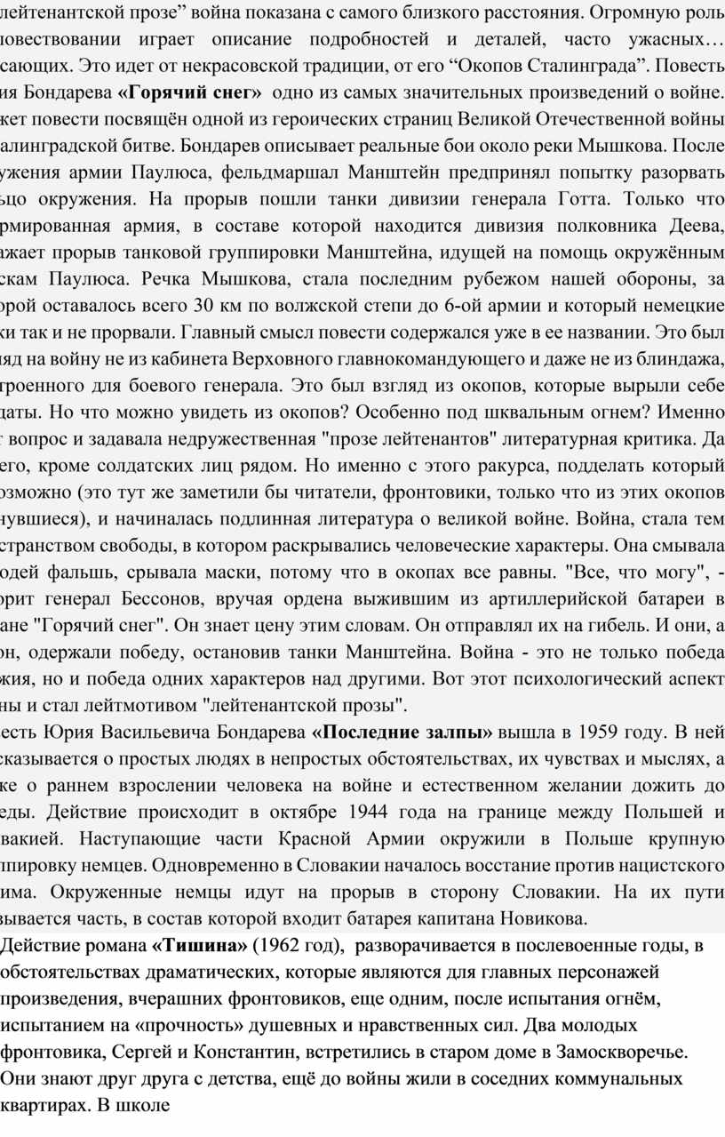 В “лейтенантской прозе” война показана с самого близкого расстояния. Огромную роль в повествовании играет описание подробностей и деталей, часто ужасных… ужасающих. Это идет от некрасовской традиции, от его “Окопов Сталинграда”. Повесть Юрия Бондарева «Горячий снег» одно из самых значительных произведений о войне. Сюжет повести посвящён одной из героических страниц Великой Отечественной войны - Сталинградской битве. Бондарев описывает реальные бои около реки Мышкова. После окружения армии Паулюса, фельдмаршал Манштейн предпринял попытку разорвать кольцо окружения. На прорыв пошли танки дивизии генерала Готта. Только что сформированная армия, в составе которой находится дивизия полковника Деева, отражает прорыв танковой группировки Манштейна, идущей на помощь окружённым войскам Паулюса. Речка Мышкова, стала последним рубежом нашей обороны, за которой оставалось всего 30 км по волжской степи до 6-ой армии и который немецкие танки так и не прорвали. Главный смысл повести содержался уже в ее названии. Это был взгляд на войну не из кабинета Верховного главнокомандующего и даже не из блиндажа, построенного для боевого генерала. Это был взгляд из окопов, которые вырыли себе солдаты. Но что можно увидеть из окопов? Особенно под шквальным огнем? Именно этот вопрос и задавала недружественная "прозе лейтенантов" литературная критика. Да ничего, кроме солдатских лиц рядом. Но именно с этого ракурса, подделать который невозможно (это тут же заметили бы читатели, фронтовики, только что из этих окопов вернувшиеся), и начиналась подлинная литература о великой войне. Война, стала тем пространством свободы, в котором раскрывались человеческие характеры. Она смывала с людей фальшь, срывала маски, потому что в окопах все равны. "Все, что могу", - говорит генерал Бессонов, вручая ордена выжившим из артиллерийской батареи в романе "Горячий снег". Он знает цену этим словам. Он отправлял их на гибель. И они, а не он, одержали победу, остановив танки Манштейна. Война - это не только победа оружия, но и победа одних характеров над другими. Вот этот психологический аспект войны и стал лейтмотивом "лейтенантской прозы".