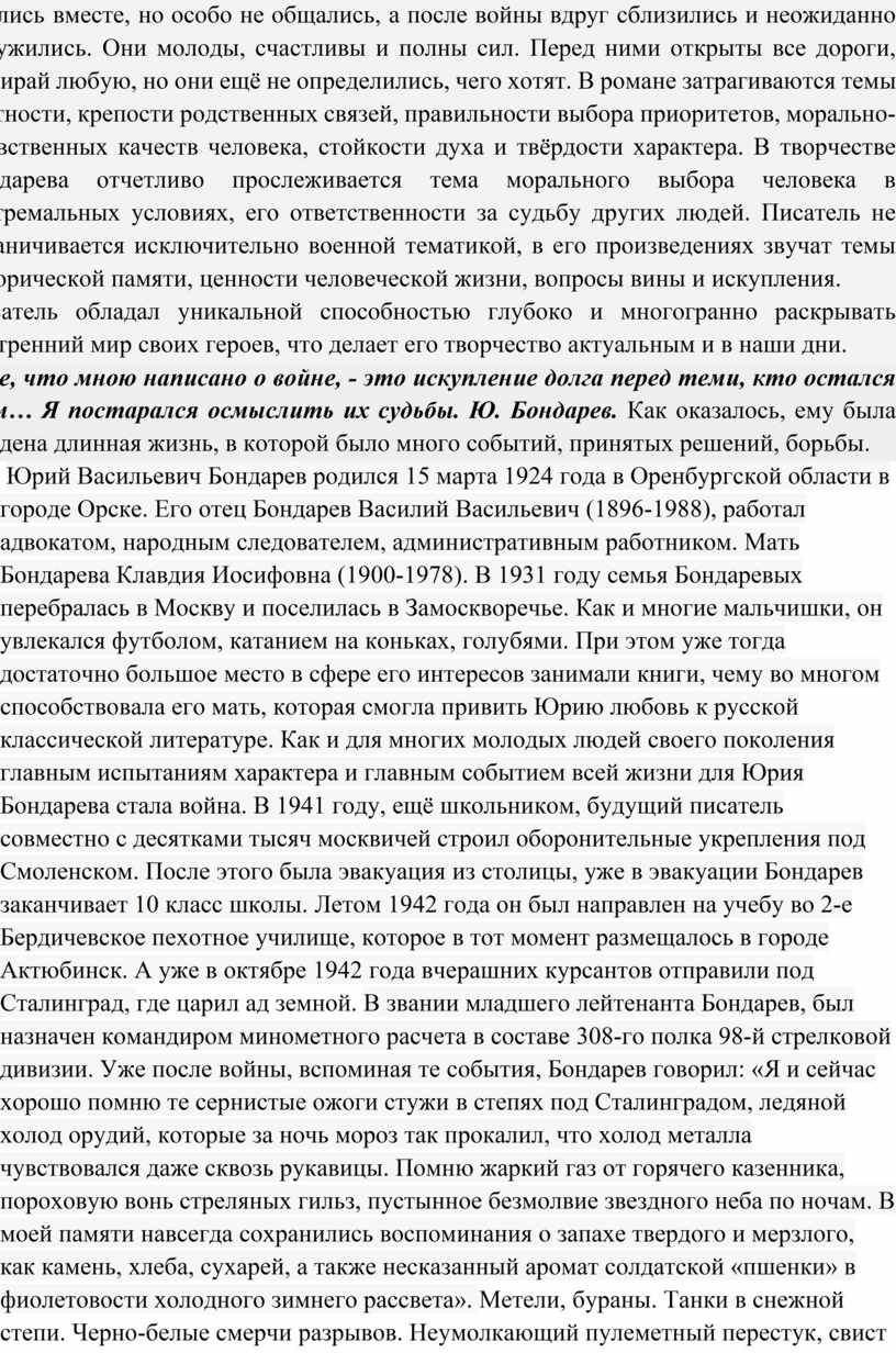 «Все, что мною написано о войне, - это искупление долга перед теми, кто остался там… Я постарался осмыслить их судьбы. Ю. Бондарев. Как оказалось, ему была суждена длинная жизнь, в которой было много событий, принятых решений, борьбы.