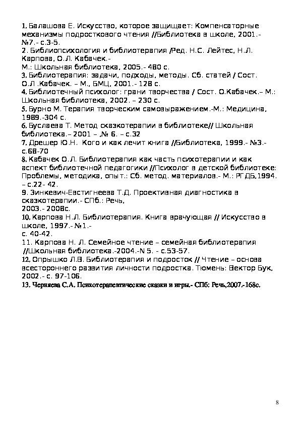 8. Кабачек О.Л. Библиотерапия как часть психотерапии и как