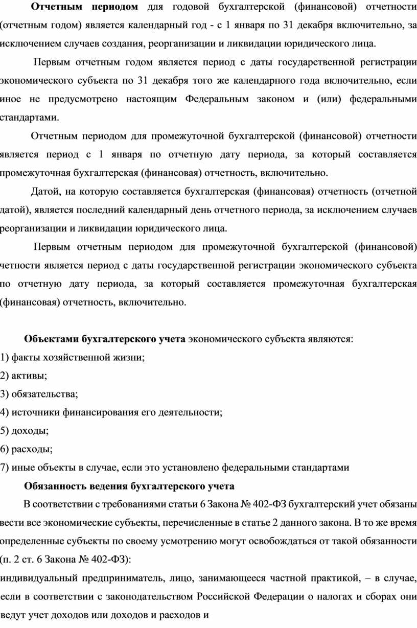 Отчетным периодом для годовой бухгалтерской (финансовой) отчетности (отчетным годом) является календарный год - с 1 января по 31 декабря включительно, за исключением случаев создания, реорганизации и ликвидации юридического лица.