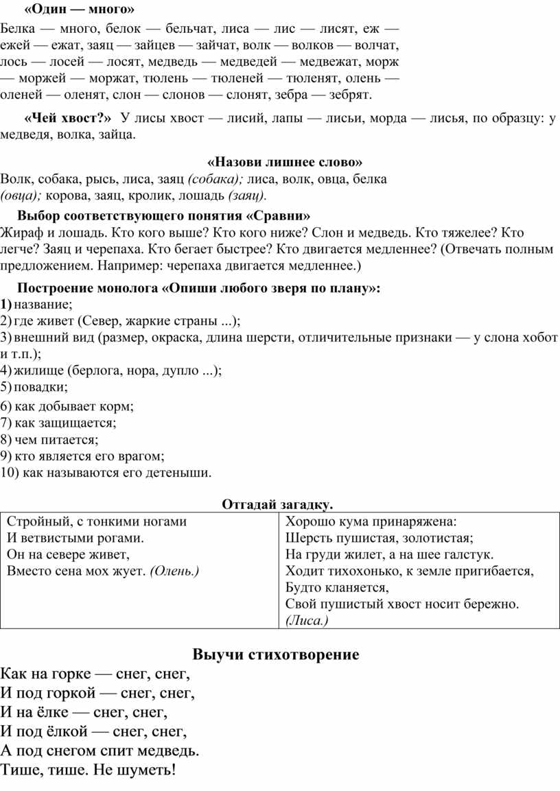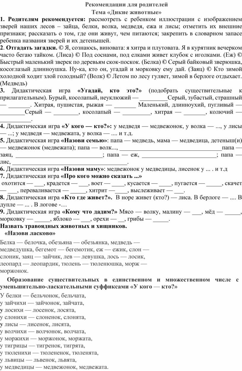 5. Дидактическая игра «Назови семью»: папа — медведь, мама — медведица, детеныш(и) — медвежонок (медвежата); папа — волк..., _________________________________папа — заяц, ____________________________; папа — еж, ________________________; папа — лис, _____________________________________.