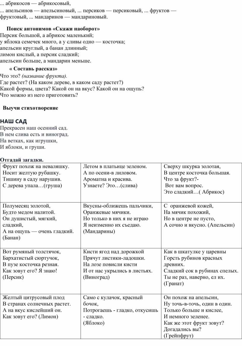 названия: яблоко, груша, лимон, апельсин, мандарин, вишня, персик, абрикос, слива, хурма, банан, пальма, мякоть, семена, плод, косточка, корка, яблоня, дерево, ветка, сад, урожай, полив, компот, джем, варенье, сок;