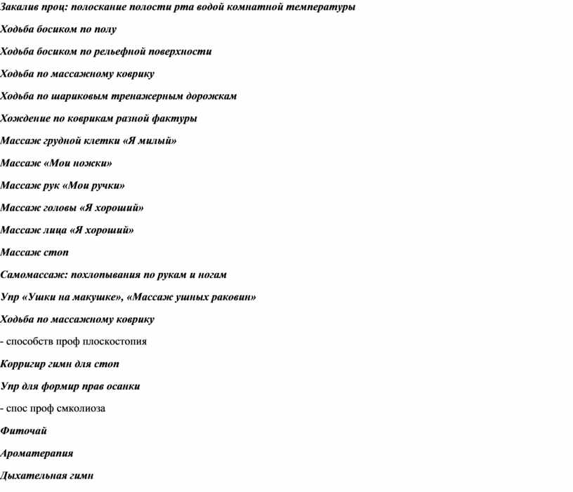 Проф меропр: - обтирание рук до локтя холодной водой; - ходьба по массажным дорожкам - умывание прохладной водой |