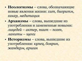 Цель урока: создать условия для углубления знаний по лексике, отработки навыка определения и различения архаизмов, историзмов и неологизмов; учить находить данные слова в тексте, составлять с ними предложения, пояснять причины устаревания слов; содействовать развитию орфографических, пунктуационных и грамматических навыков; способствовать воспитанию самостоятельности и взаимоконтроля, расширению кругозора и словарного запаса.