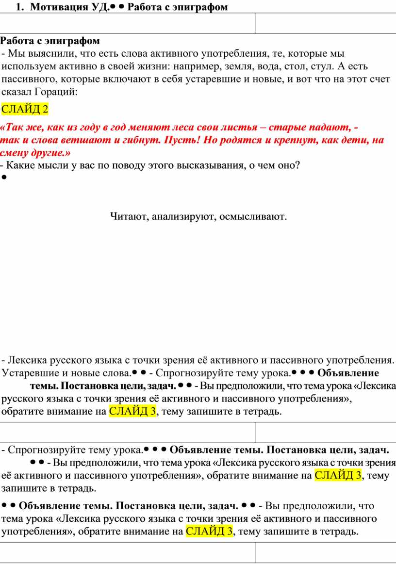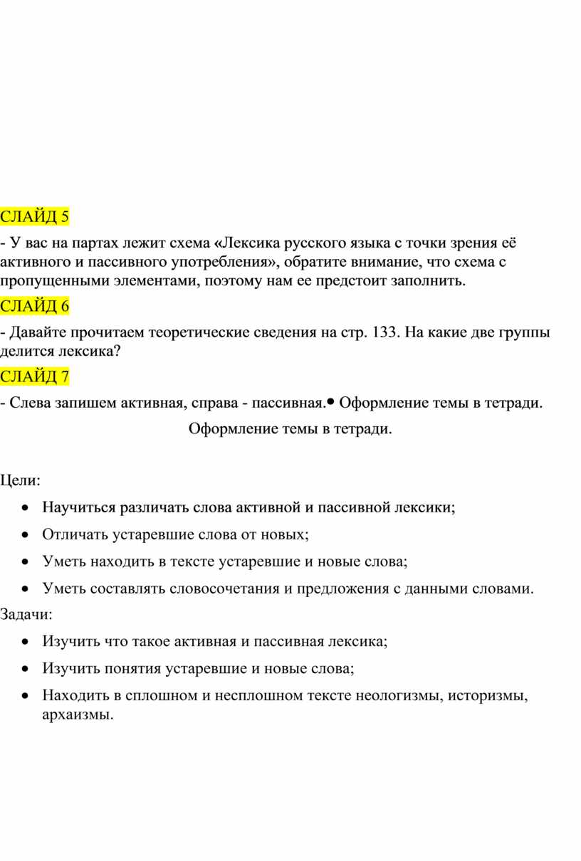 Тема: «Лексика русского языка с точки зрения её активного и пассивного употребления»