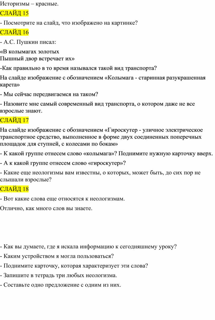 золотых -Как правильно в то время назывался такой вид транспорта? На слайде изображение с обозначением «Колымага - старинная разукрашенная карета» - Мы сейчас передвигаемся на таком? - Назовите мне самый современный вид транспорта, о котором даже не все взрослые знают. СЛАЙД 17 На слайде изображение с обозначением «Гироскутер - уличное электрическое транспортное средство, выполненное в форме двух соединенных поперечных площадок для ступней, с колесами по бокам» - К какой группе отнесем слово «колымага»? Поднимите нужную карточку вверх. - А к какой группе отнесем слово «гироскутер»? - Какие еще неологизмы вам известны, о которых, может быть, до сих пор не слышали взрослые? СЛАЙД 18 - Вот какие слова еще относятся к неологизмам. Отлично, как много слов вы знаете.