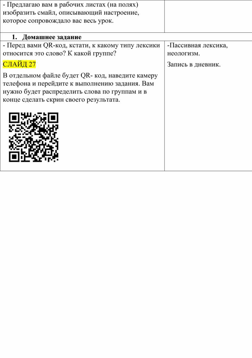 - Перед вами QR-код, кстати, к какому типу лексики относится это слово? К какой группе? СЛАЙД 27 В отдельном файле будет QR- код, наведите камеру телефона и перейдите к выполнению задания. Вам нужно будет распределить слова по группам и в конце сделать скрин своего результата.