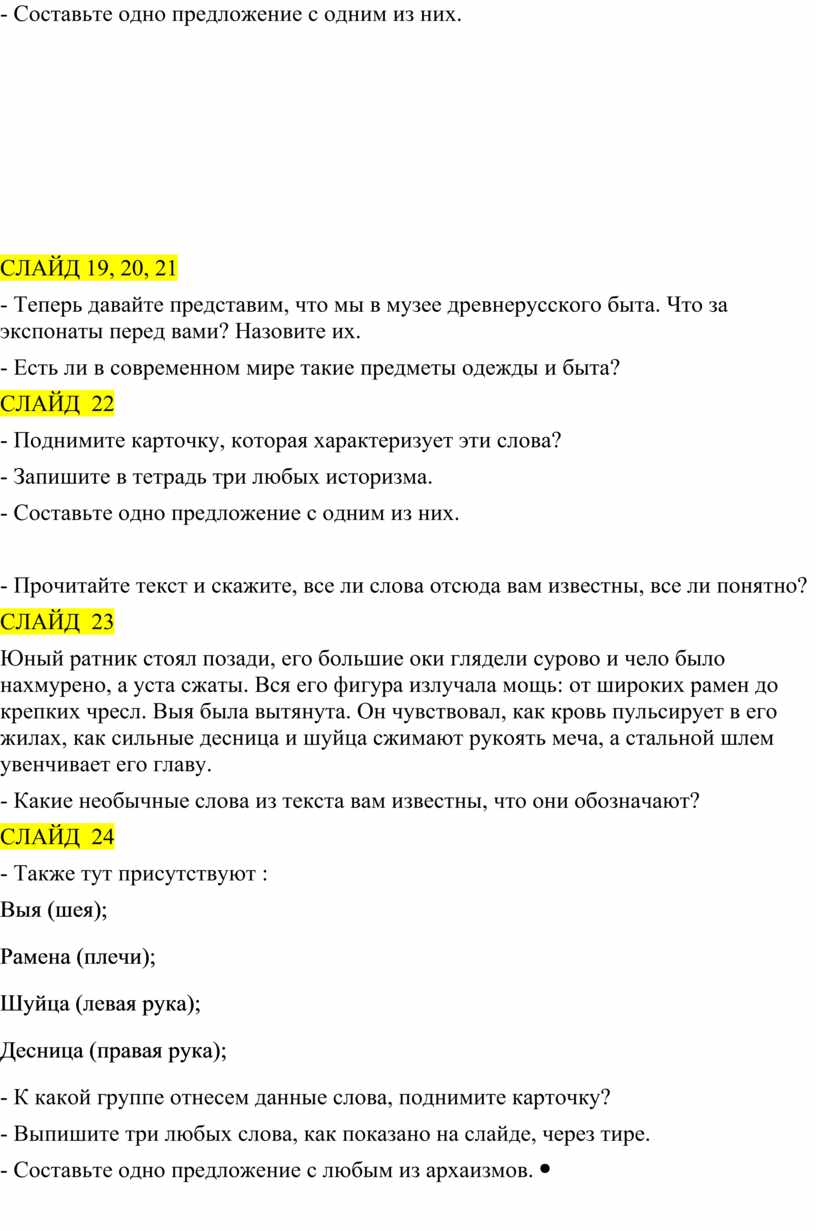 - Прочитайте текст и скажите, все ли слова отсюда вам известны, все ли понятно? СЛАЙД 23 Юный ратник стоял позади, его большие оки глядели сурово и чело было нахмурено, а уста сжаты. Вся его фигура излучала мощь: от широких рамен до крепких чресл. Выя была вытянута. Он чувствовал, как кровь пульсирует в его жилах, как сильные десница и шуйца сжимают рукоять меча, а стальной шлем увенчивает его главу. - Какие необычные слова из текста вам известны, что они обозначают? СЛАЙД 24 - Также тут присутствуют : Выя (шея); Рамена (плечи); Шуйца (левая рука); Десница (правая рука); - К какой группе отнесем данные слова, поднимите карточку? - Выпишите три любых слова, как показано на слайде, через тире. - Составьте одно предложение с любым из архаизмов.  |