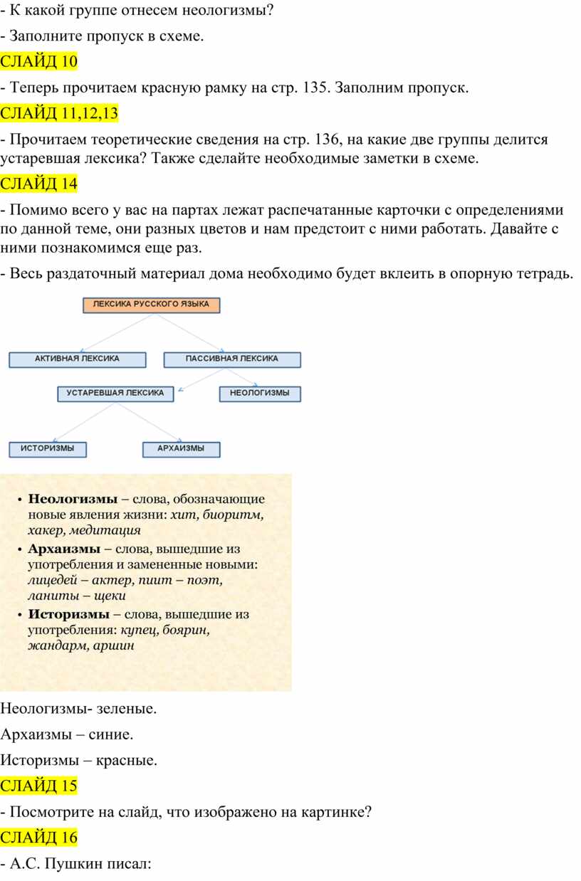- Итак, теперь мы знаем о существовании активной и пассивной лексики. А что же относится к пассивной? Читаем красную рамку, расположенную ниже. СЛАЙД 9 - К какой группе отнесем неологизмы? - Заполните пропуск в схеме. СЛАЙД 10 - Теперь прочитаем красную рамку на стр. 135. Заполним пропуск. СЛАЙД 11,12,13 - Прочитаем теоретические сведения на стр. 136, на какие две группы делится устаревшая лексика? Также сделайте необходимые заметки в схеме. СЛАЙД 14 - Помимо всего у вас на партах лежат распечатанные карточки с определениями по данной теме, они разных цветов и нам предстоит с ними работать. Давайте с ними познакомимся еще раз. - Весь раздаточный материал дома необходимо будет вклеить в опорную тетрадь.