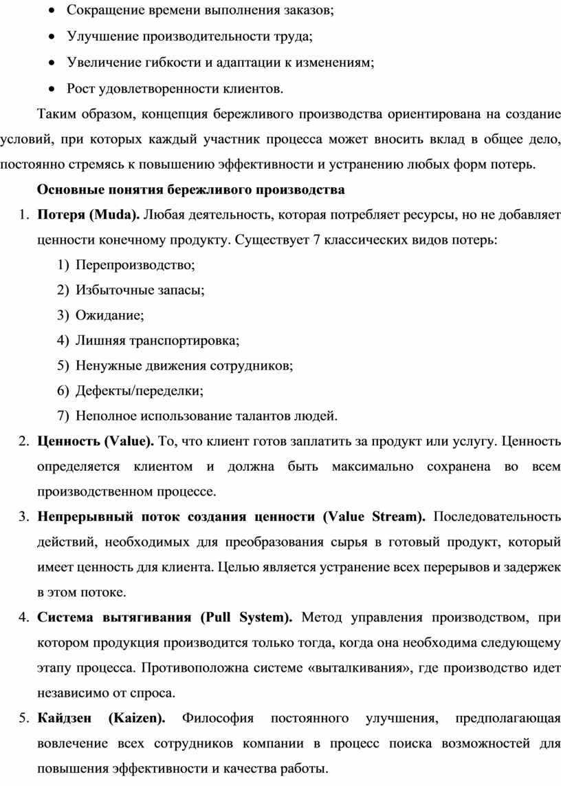 Таким образом, концепция бережливого производства ориентирована на создание условий, при которых каждый участник процесса может вносить вклад в общее дело, постоянно стремясь к повышению эффективности и устранению любых форм потерь.