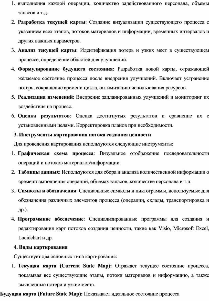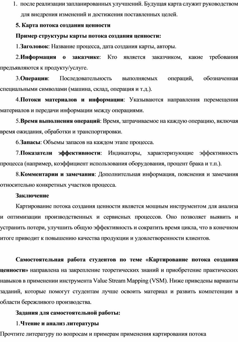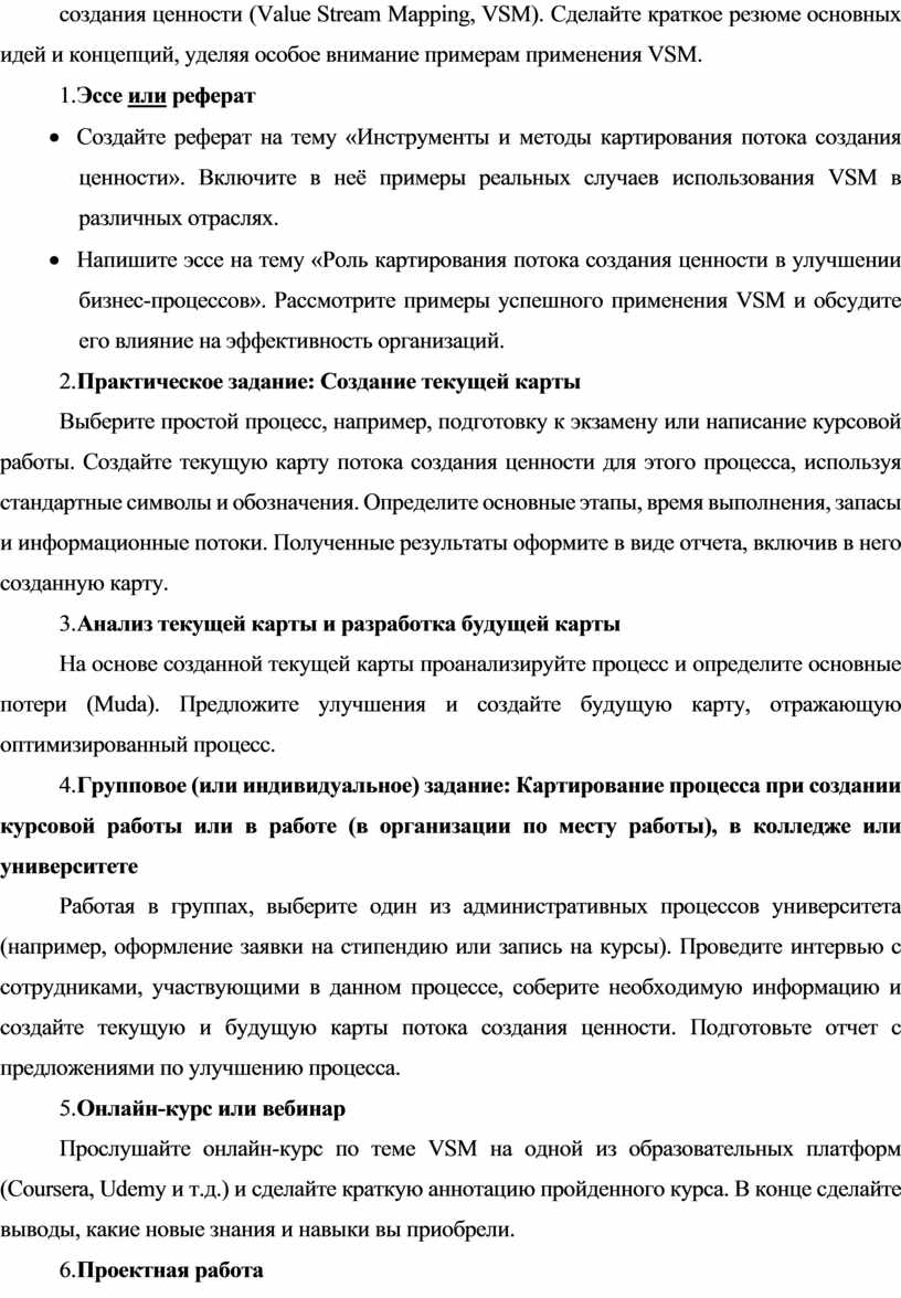 Прочтите литературу по вопросам и примерам применения картирования потока создания ценности (Value Stream Mapping, VSM). Сделайте краткое резюме основных идей и концепций, уделяя особое внимание примерам применения VSM. 2. Эссе или реферат