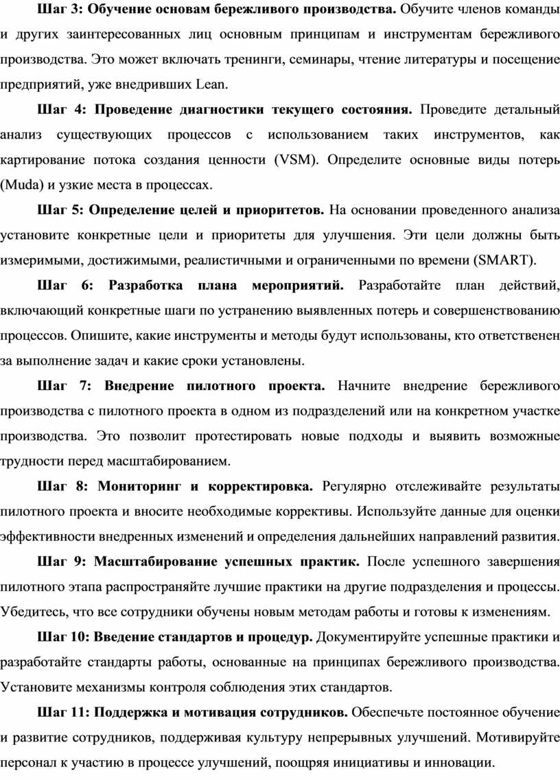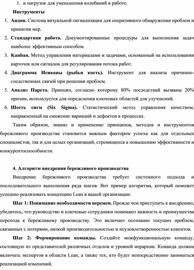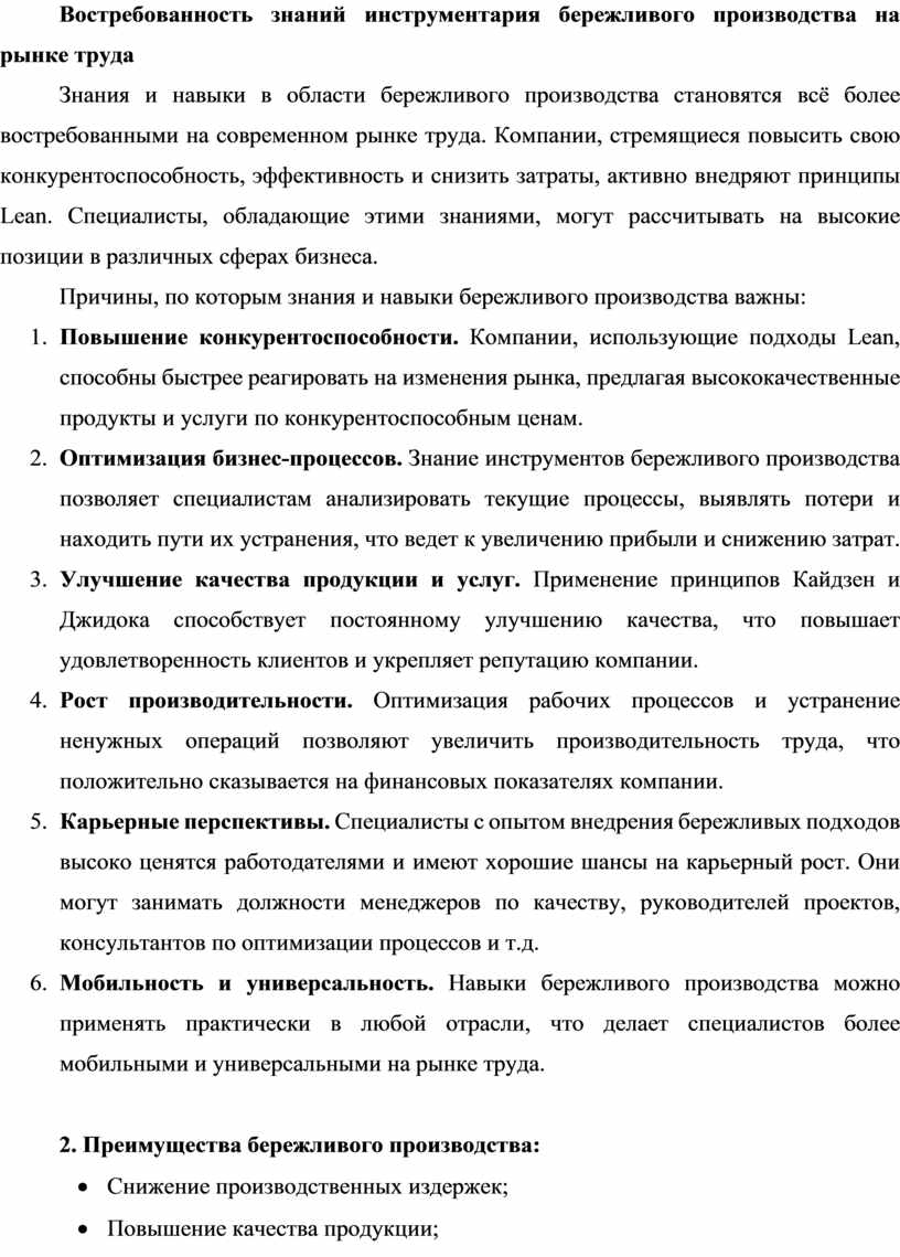 Таким образом, знание и применение принципов, методов и инструментов бережливого производства становится важным фактором успеха как для отдельных специалистов, так и для целых организаций, стремящихся к повышению эффективности и конкурентоспособности.