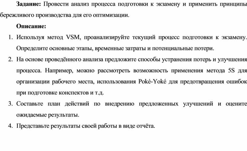 Задание: Провести анализ процесса подготовки к экзамену и применить принципы бережливого производства для его оптимизации.