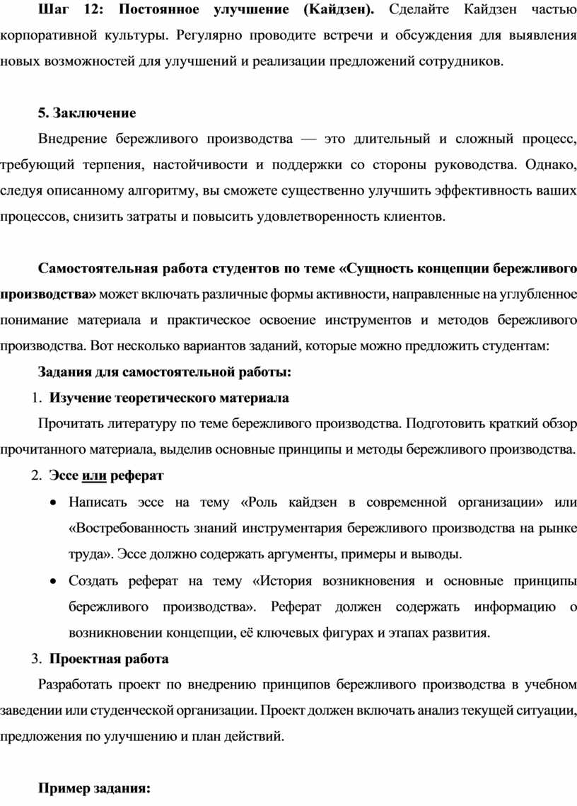Самостоятельная работа студентов по теме «Сущность концепции бережливого производства» может включать различные формы активности, направленные на углубленное понимание материала и практическое освоение инструментов и методов бережливого производства. Вот несколько вариантов заданий, которые можно предложить студентам: