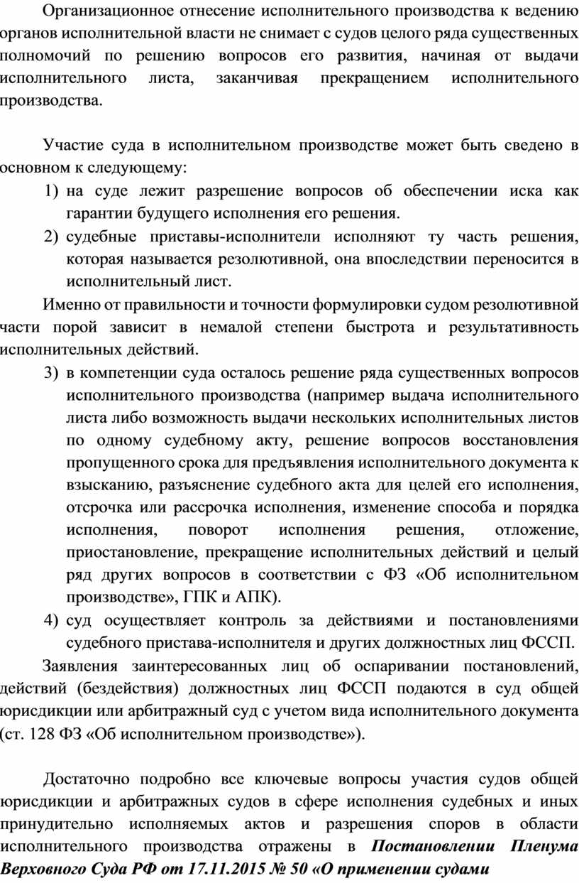Достаточно подробно все ключевые вопросы участия судов общей юрисдикции и арбитражных судов в сфере исполнения судебных и иных принудительно исполняемых актов и разрешения споров в области исполнительного производства отражены в Постановлении Пленума Верховного Суда РФ от 17.11.2015 № 50 «О применении судами законодательства при рассмотрении некоторых вопросов, возникающих в ходе исполнительного производства».