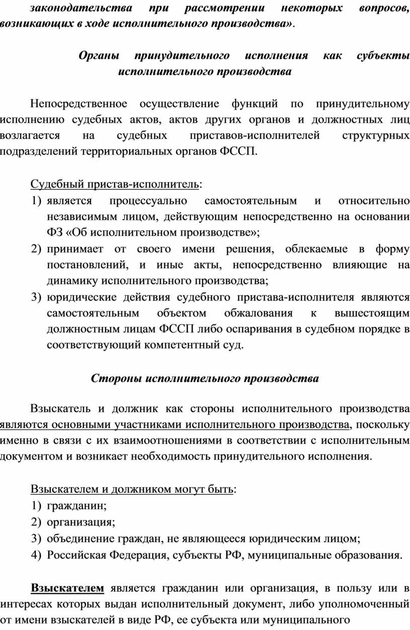 Тема: Субъекты исполнительного производства. Органы принудительного исполнения