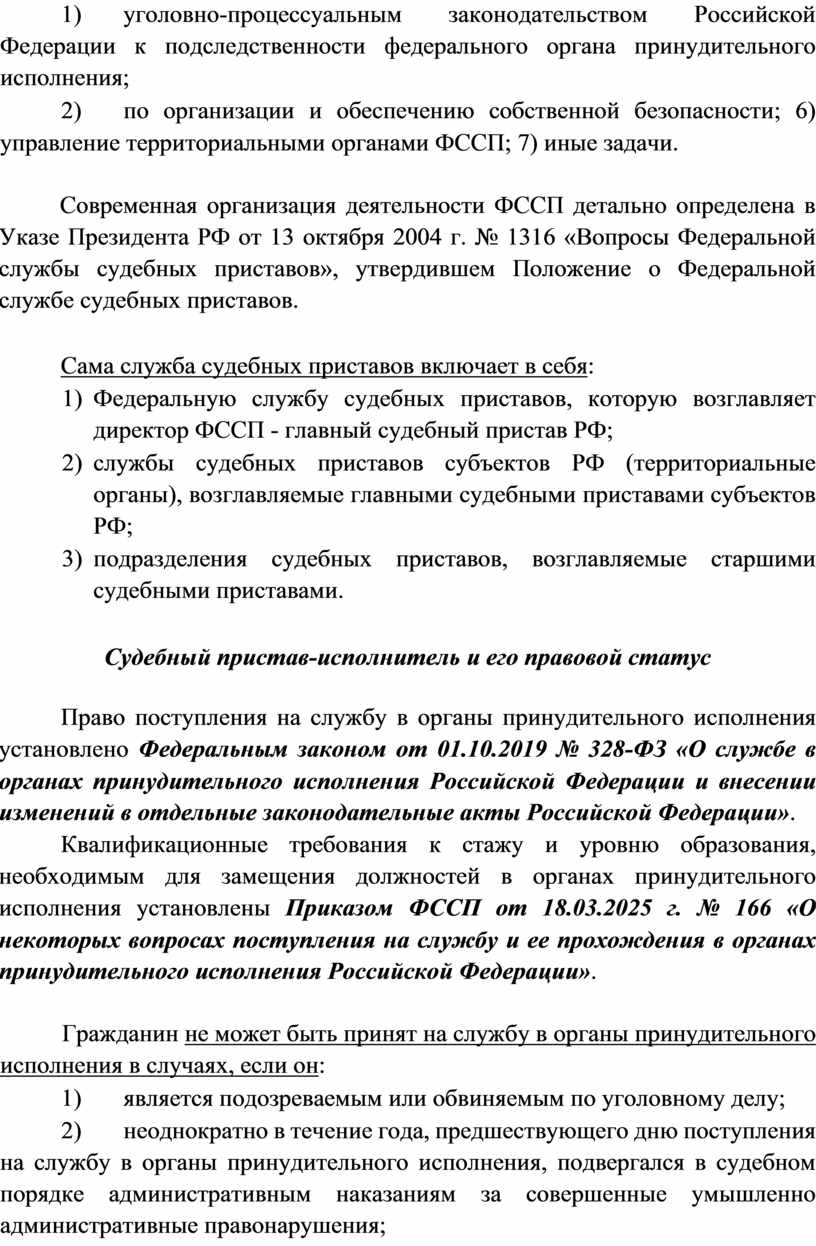 Квалификационные требования к стажу и уровню образования, необходимым для замещения должностей в органах принудительного исполнения установлены Приказом ФССП от 18.03.2025 г. № 166 «О некоторых вопросах поступления на службу и ее прохождения в органах принудительного исполнения Российской Федерации».