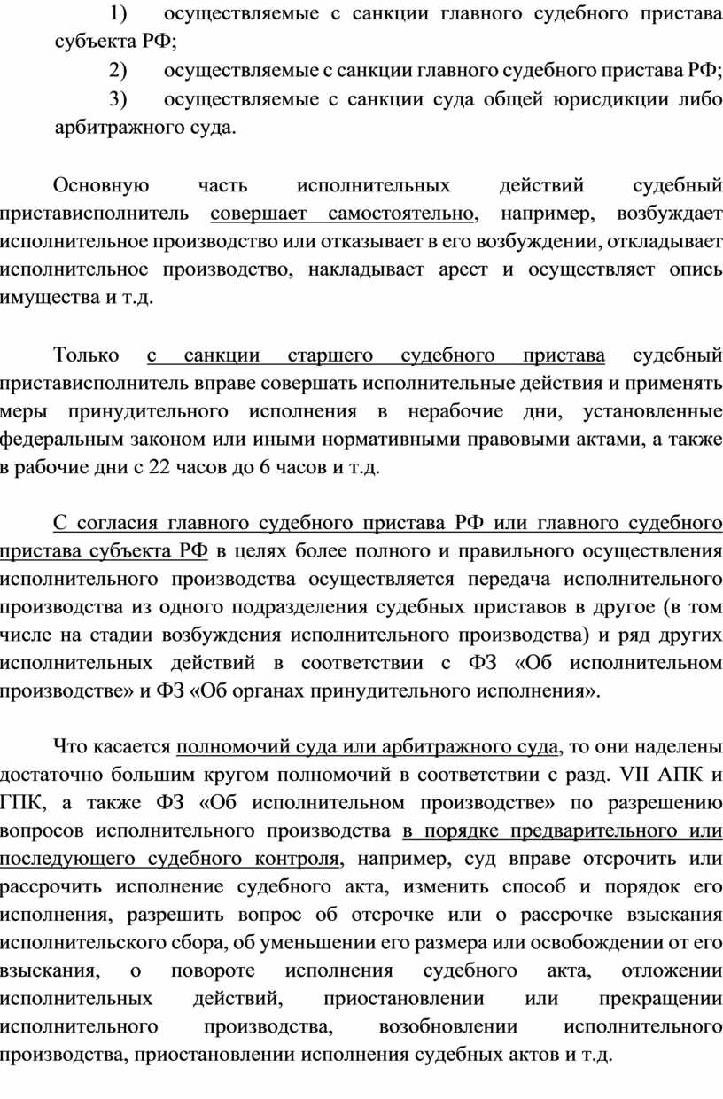 Что касается полномочий суда или арбитражного суда, то они наделены достаточно большим кругом полномочий в соответствии с разд. VII АПК и ГПК, а также ФЗ «Об исполнительном производстве» по разрешению вопросов исполнительного производства в порядке предварительного или последующего судебного контроля, например, суд вправе отсрочить или рассрочить исполнение судебного акта, изменить способ и порядок его исполнения, разрешить вопрос об отсрочке или о рассрочке взыскания исполнительского сбора, об уменьшении его размера или освобождении от его взыскания, о повороте исполнения судебного акта, отложении исполнительных действий, приостановлении или прекращении исполнительного производства, возобновлении исполнительного производства, приостановлении исполнения судебных актов и т.д.