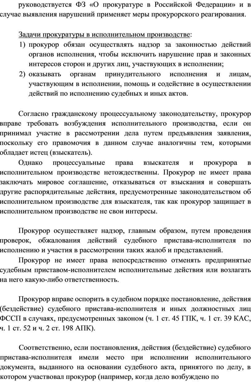 Соответственно, если постановления, действия (бездействие) судебного пристава-исполнителя имели место при исполнении исполнительного документа, выданного на основании судебного акта, принятого по делу, в котором участвовал прокурор (например, когда дело возбуждено по инициативе прокурора), то прокурор вправе их оспаривать в судебном порядке при наличии условий, указанных в названных нормах.