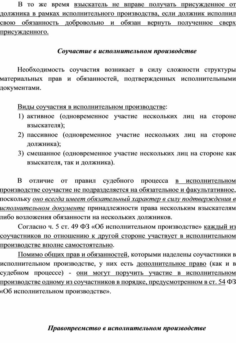 В отличие от правил судебного процесса в исполнительном производстве соучастие не подразделяется на обязательное и факультативное, поскольку оно всегда имеет обязательный характер в силу подтверждения в исполнительном документе принадлежности права нескольким взыскателям либо возложения обязанности на нескольких должников.