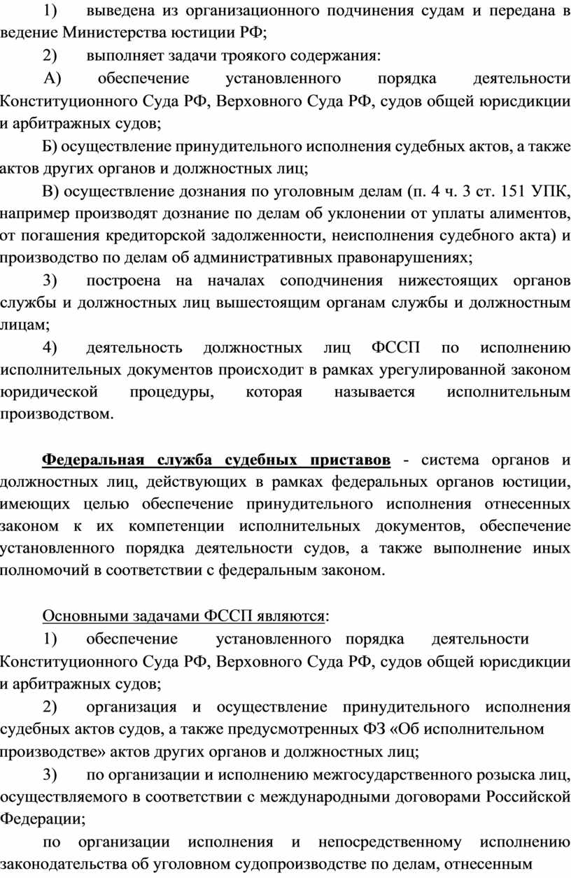 Федеральная служба судебных приставов - система органов и должностных лиц, действующих в рамках федеральных органов юстиции, имеющих целью обеспечение принудительного исполнения отнесенных законом к их компетенции исполнительных документов, обеспечение установленного порядка деятельности судов, а также выполнение иных полномочий в соответствии с федеральным законом.