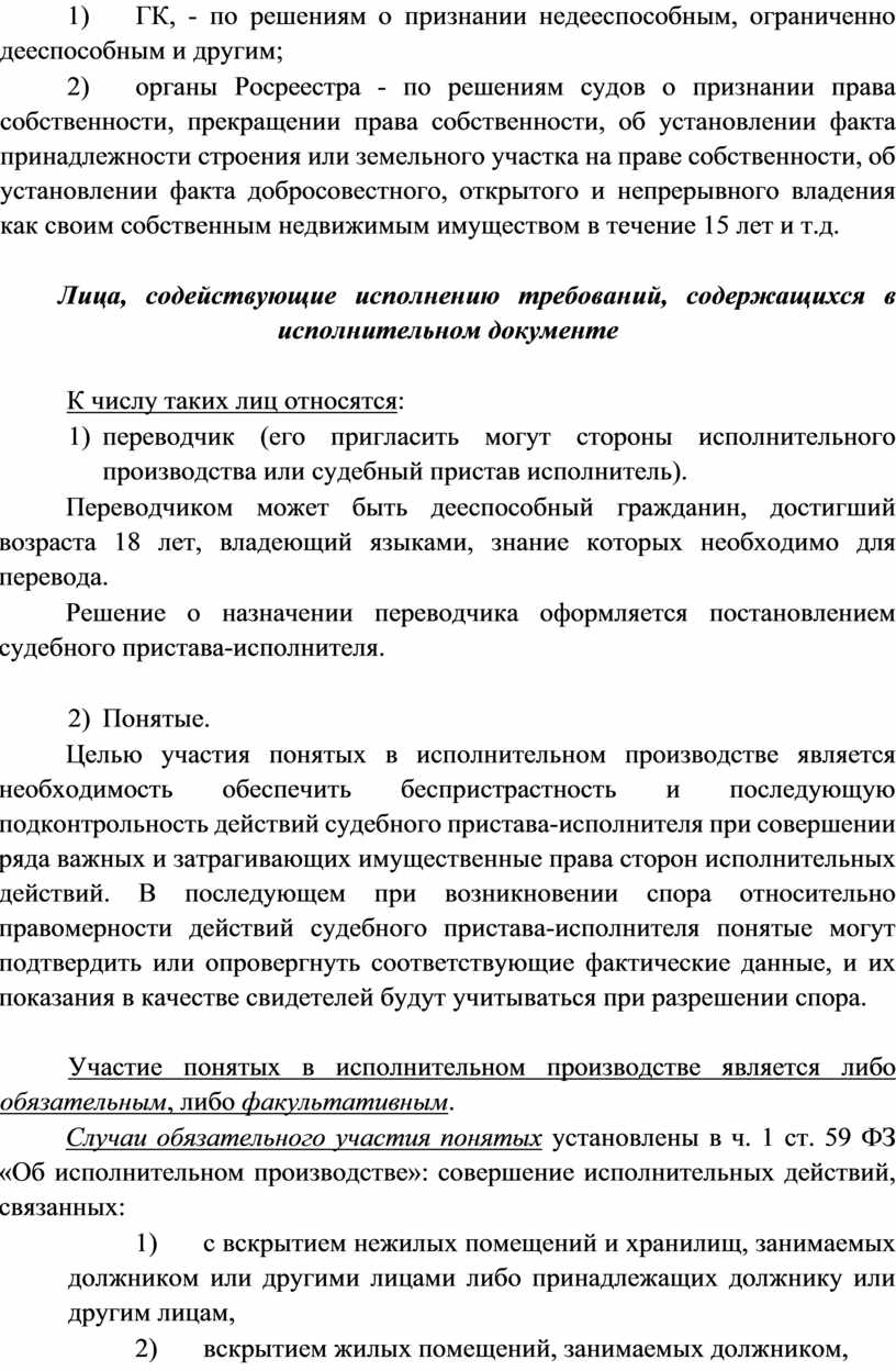 5) лица, содействующие процессу исполнения (переводчик, понятые, специалист, лицо, которому судебным приставом-исполнителем передано под охрану или на хранение арестованное имущество, и другие (см. ст. ст. 58 - 63 ФЗ «Об исполнительном производстве»).