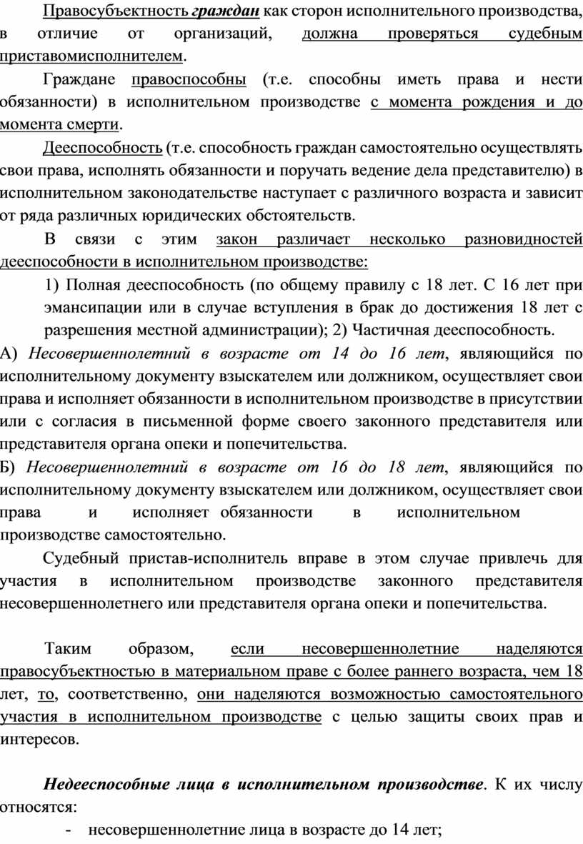 Таким образом, если несовершеннолетние наделяются правосубъектностью в материальном праве с более раннего возраста, чем 18 лет, то, соответственно, они наделяются возможностью самостоятельного участия в исполнительном производстве с целью защиты своих прав и интересов.