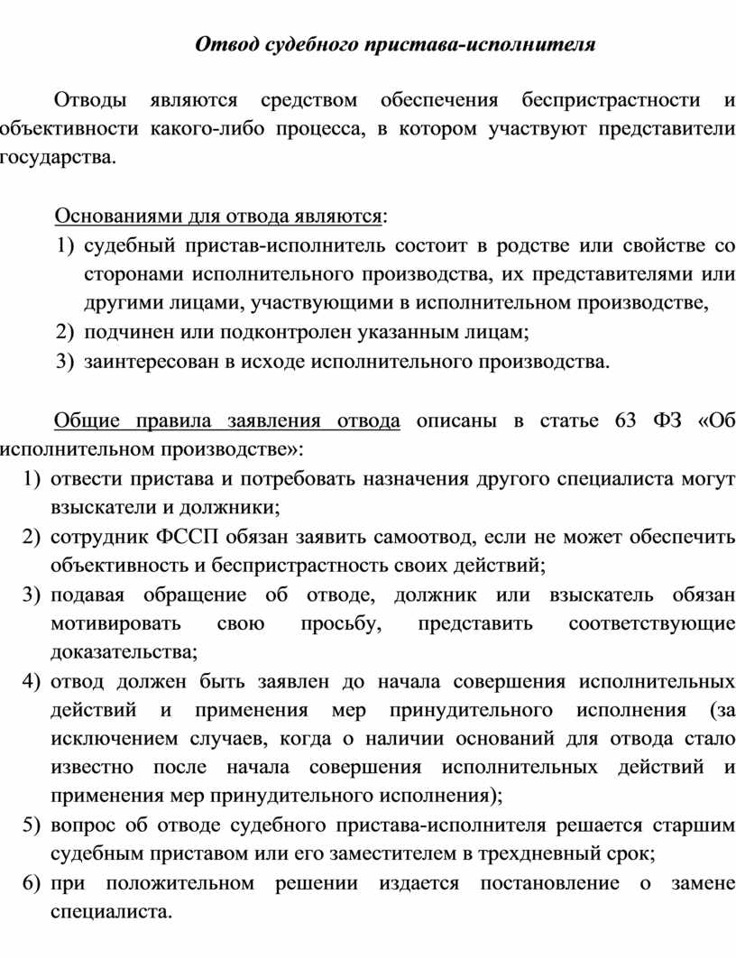 Общие правила заявления отвода описаны в статье 63 ФЗ «Об исполнительном производстве»: