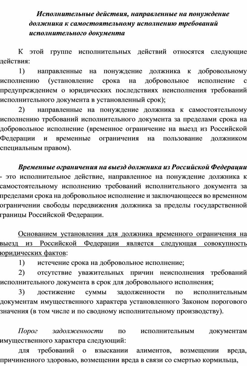 Если судебный пристав-исполнитель дополнительно установит временные ограничения на выезд должника из Российской Федерации (ст. 67 ФЗИП), ограничит пользование должником специального права (ст. 67.1 ФЗИП), наложит арест на имущество должника (арест может быть наложен одновременно с возбуждением исполнительного производства независимо от установления срока на добровольное исполнение), то это будет мерой косвенного принуждения, направленной на причинение должнику неудобств и побуждающей его к скорейшему исполнению требований исполнительного документа.