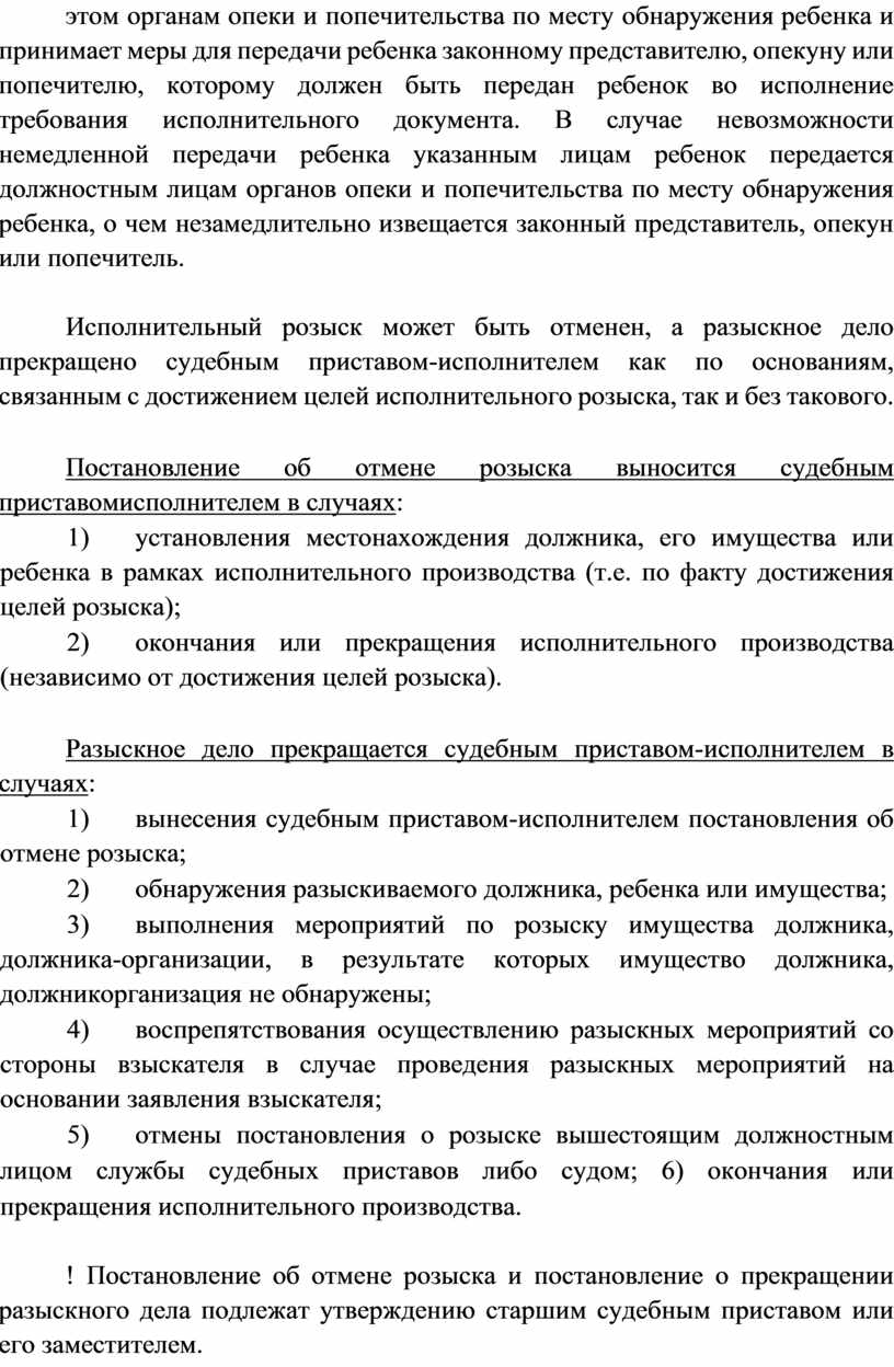 4) Одновременно с окончанием исполнительного производства судебным приставом-исполнителем отменяются розыск должника, его имущества, розыск ребенка, а также установленные для должника ограничения, в том числе ограничения на выезд из Российской Федерации, на пользование специальными правами и ограничения прав должника на его имущество.